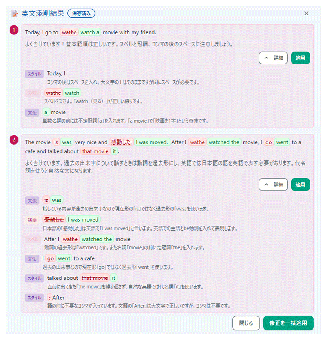 AIによる即座の添削と