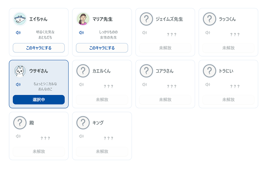 キャラクターは、日記を書いた日数に応じて、自分で選択できるようになります。全10キャラを目指して、毎日の習慣にしましょう。