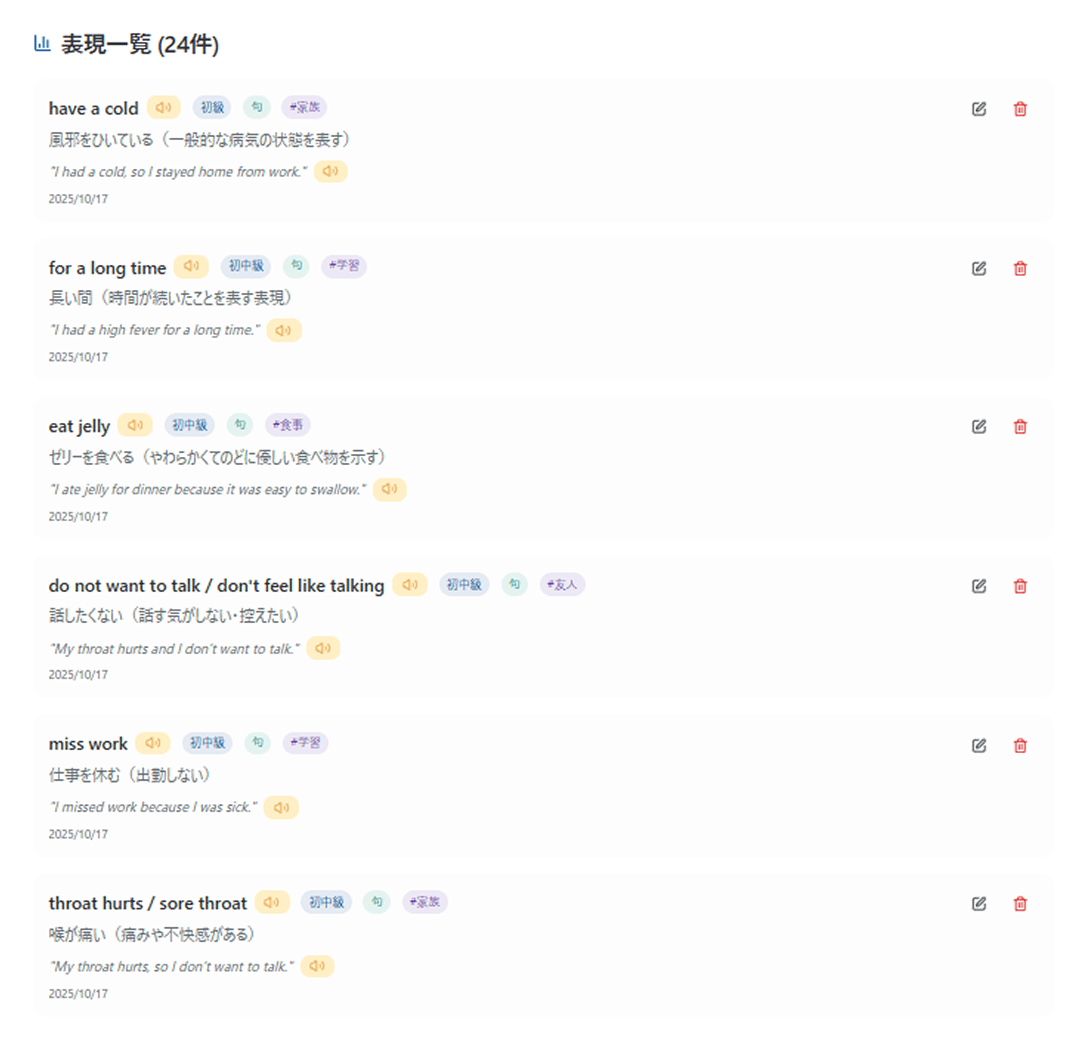 自分だけの単語帳学んだ表現を保存して、いつでも復習できます。
