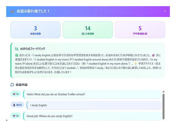 会話が終わった後には、AIからフィードバックが送られ、振り返り学習にも役立ちます。