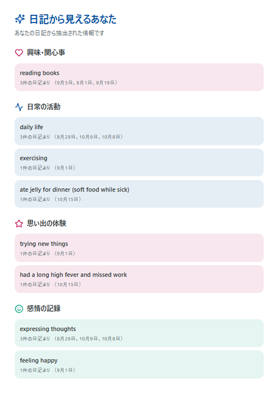 自然と話題をリードしてくれる対話型の入力モードが、日記を書くことのハードルを下げてくれてただノートに書こうとするよりも、気持ち楽に書けています。
