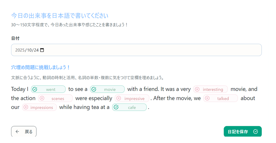 日本語で日記を書くだけで、AIが最適な英作文トレーニングを自動生成。英語での文章作成に苦手意識がある人も、ヒントを参考にしながら、まずは正しい英文の「型」を学ぶことから始められます。語彙や文法の定着に特に効果的です。