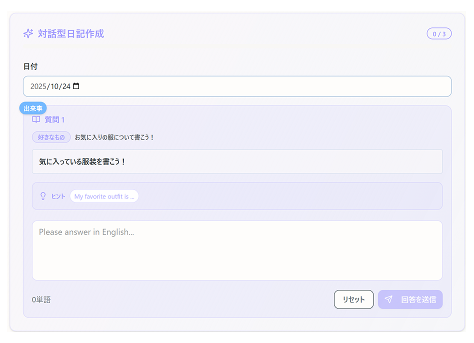 「何を書けばいいかわからない」という人を、AIが自然にライティングへと導きます。AIからの質問に短い英語で答えていくだけで、最終的に一つのまとまった日記が完成。